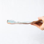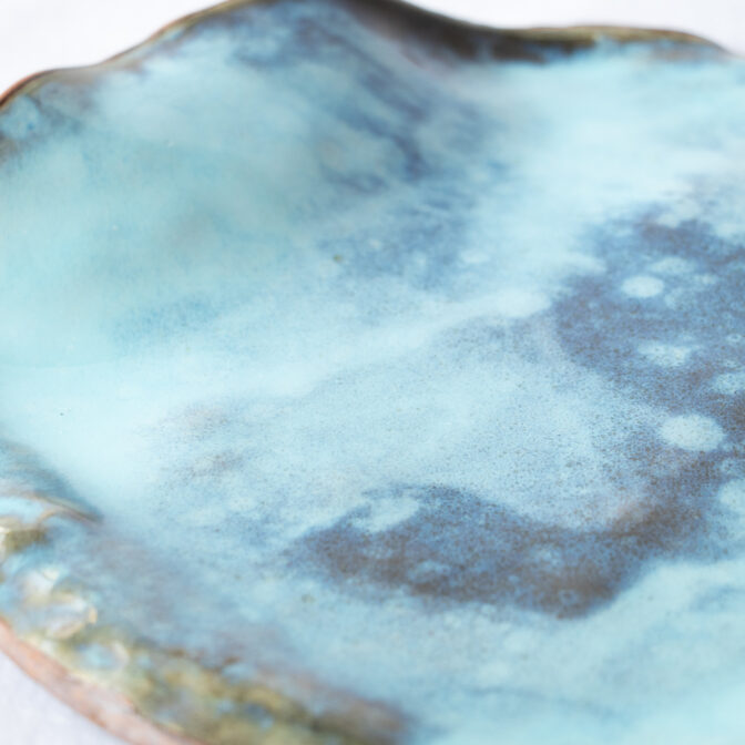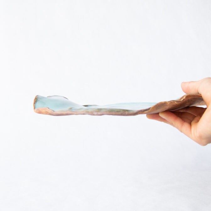 このお皿のポイントは 土を3種類混ぜて、その土の色の違いで一度表情を作って、その上から半透明の水色の釉薬が重なっている 多層的な見た目にあります。