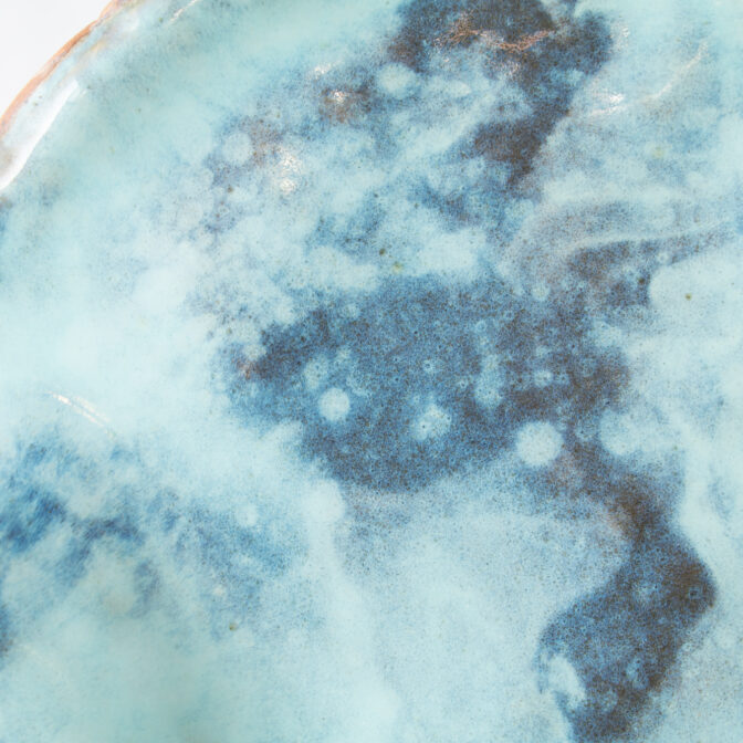 この水色の釉薬は本来であればテカテカつるつるに仕上がるんですけど、一度本焼きしたものをもう一度、今度は1度目よりも低温で焼き直すことによって釉薬のガラス面からツヤが落ち、マットよりの半光沢な質感を獲得しています。