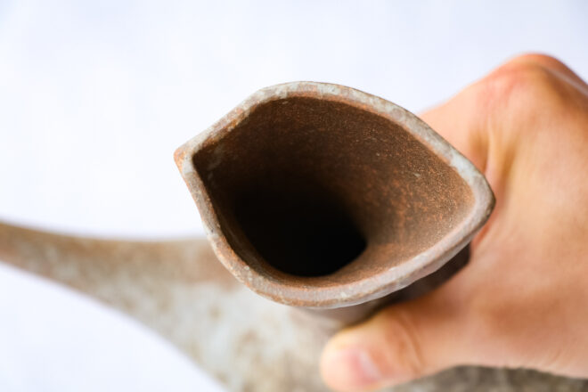 まず差を作ろうと意識したのは全体の形の滑らかさで、細く伸びた注ぎ口と、胴体部分と、上に伸びた持ち手部分の組み合わさった形が一体感を持つように、流動的な形を心がけました。イメージは帆船とかの船首ですね。