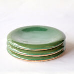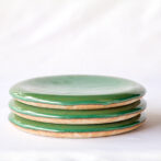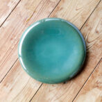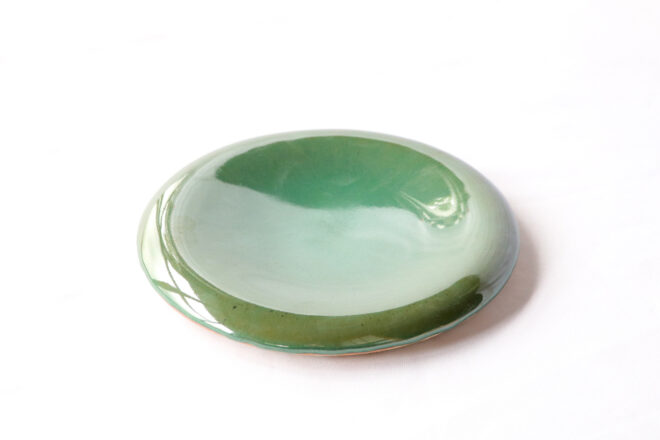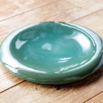 お皿のオーダーではマットな釉薬や、そもそも釉薬がかかっていないような質感のものを求められるのが多いのですが、このお皿では総緑青の釉薬をもうつるんつるんにしての焼き上げとなっておりまして、この滑らかな曲線の赤血球みたいな形が つるんつるんの釉薬と相まって、マット系とはまた違った魅力があると思います。ていうかこのお皿はどんな釉薬でも大体綺麗に見えますね。形がちょうどいいんでしょうね。