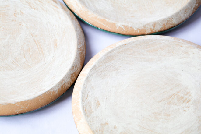 裏側は白の化粧土を刷毛塗りして、上から薄く釉薬を吹き付けて、土の質感を残しつつ、浸水性を無くした作りになっています。裏面はまるんとしたフチではなく、エッジのある作りになっています。これは重ねやすくするためと、持つときに指が入りやすくなるためです。表裏使えると言いつつ、基本的には表面中心で使う形になっていますね。