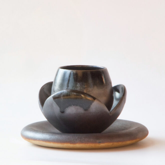 このお皿の元は「スイーツのための器セット」というオーダーで作った、エスプレッソのための器「コロン」と、ジェラートのための器「ワリザンショウ」、そしてケーキ用の「サラ」という3点セットの一番下のお皿になります。これですね↓