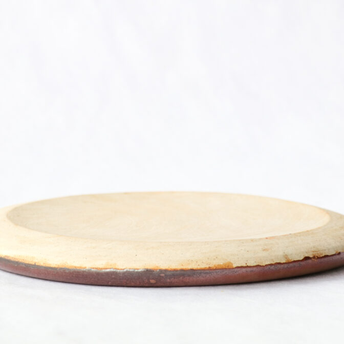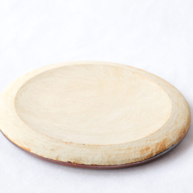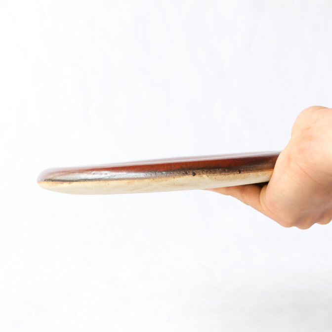 また表裏で使えるという特性を活かして、季節によって料理を変更した際に、お皿のイメージも変えたい という要望もありましたので、おもて面は鉄赤のメタリックな印象に、うら面は白の化粧土を刷毛塗りしたオーガニックで土の素朴感を感じられる印象に、と おもてうらの印象を全く異なるものにしました。