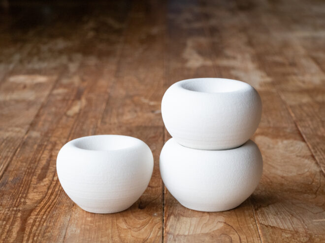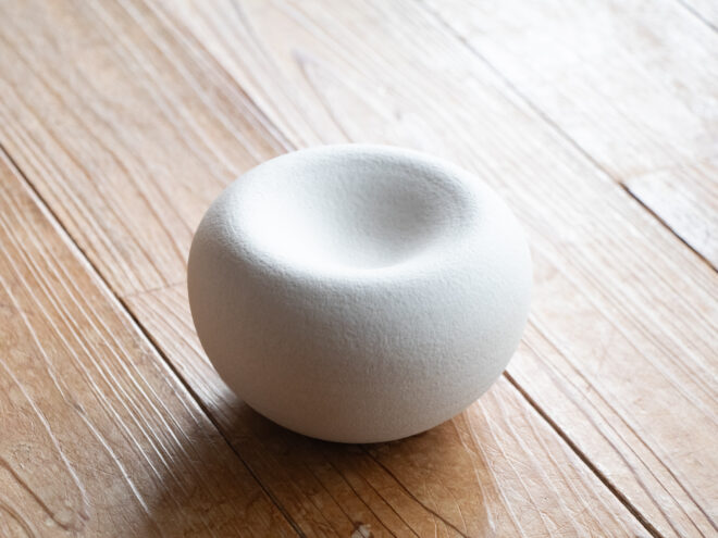 この白はカオリンという白く安定した鉱物で作られておりまして、そのカオリンを2層に重ねることで柔らかい質感を持ちつつ、食器として実用できるよう作られております。ただその温度帯が非常にデリケートで、ちょうどよく焼けてくれるかどうかは結局のところ運だったりします。